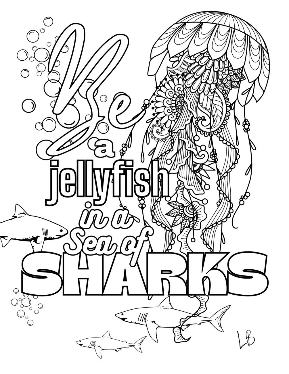 Indulge in the beauty of this intricately designed coloring page featuring a stunning jellyfish and sharks with the inspiring words "Be a jellyfish in a sea of sharks" in large print. With a difficulty rating of Level 2, this page is perfect for anyone looking to unwind and tap into their creativity.
