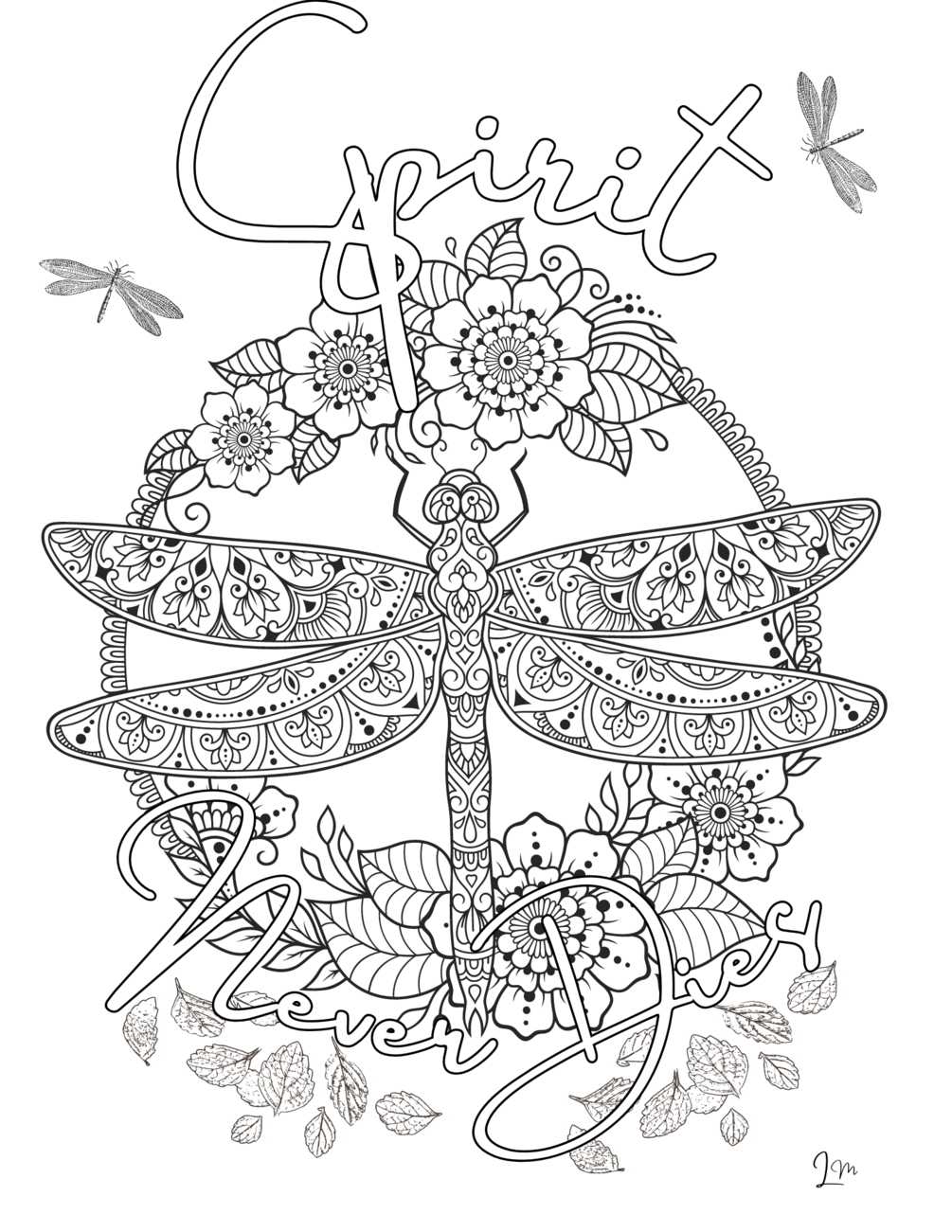 Indulge in the beauty of this intricately designed coloring page featuring a stunning dragonfly and the inspiring words "Spirit Never Dies" in large print. With a difficulty rating of Level 2, this page is perfect for anyone looking to unwind and tap into their creativity.